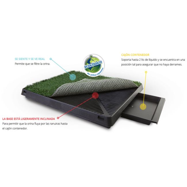 Green Carpet Deluxe tiene un sistema de drenaje de la orina y es eficaz tanto para perros grandes como pequeños. Es fácil de usar, fácil de limpiar, el pasto sintético asegura una larga duración del producto que va a resolver una y otra vez los problemas con la orina de tu perro.