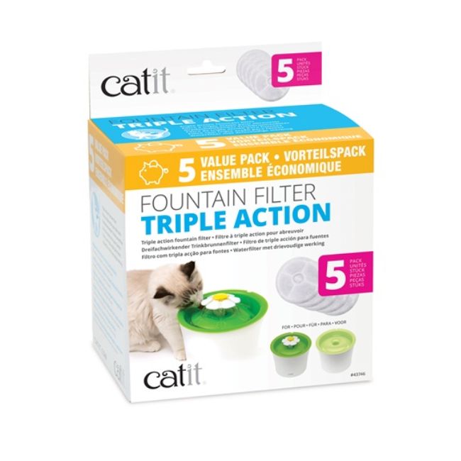 Los filtros de fuente de triple acción Catit no están diseñados para curar ninguna enfermedad o dolencia; sin embargo, estos filtros ayudan a eliminar los olores y las impurezas y filtran los desechos.