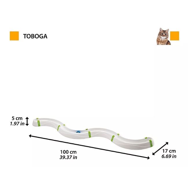 Ideal para: Gatos de todos los tamaños y edadesLa máxima diversión para su gato gracias a este original juguete de forma serpenteante. Es perfecto para mantenerlo en forma y divertido. Toboga está hecho de plástico duro y es muy fácil de montar. Incluido con el producto, encontrará una pelota con luz de led intermitente que se activa con el movimiento.