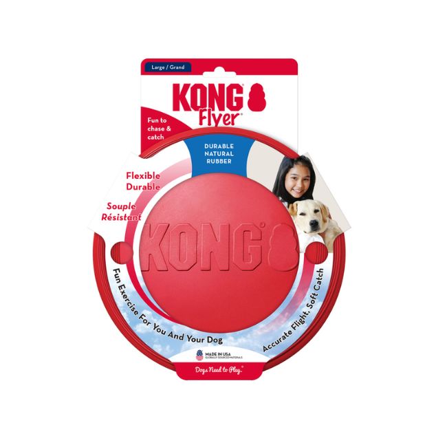 El KONG Classic Flyer es ideal para el juego de buscar y recoger. Está fabricado con KONG Classic, un caucho resistente que permite atraparlo sin riesgos y ofrece un rebote dinámico en caso de que su perro no atrape el juguete en el primer lanzamiento. Regálele a su perro una experiencia única con el juego que más le gusta; este disco es más seguro que los demás, buscarlo y recogerlo le garantizará toneladas de actividad saludable.