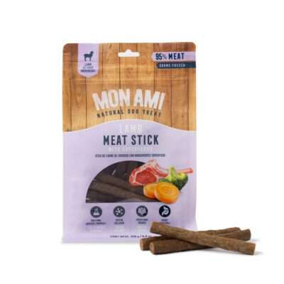 Snack Saudable de Cordero para Perros. Nuestra línea Meat Sticks es un best seller en Mon Ami. Este delicioso snack saludable de sabor irresistible contiene una forma y textura ideal para la masticación. Diseñado para reforzar el vínculo entre humanos y mascotas, este stick a base de carne fresca real de cordero es la dosis de alegría perfecta para el comienzo o el cierre del día. Esta presentación es única en el mercado y la favorita de nuestra comunidad.