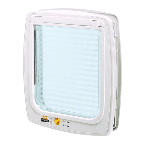 Otra característica importante es el sistema de cierre de 4 vías, que te permite regular la apertura de la puerta según tus necesidades: solo entrada, solo salida, entrada y salida o cerrado.