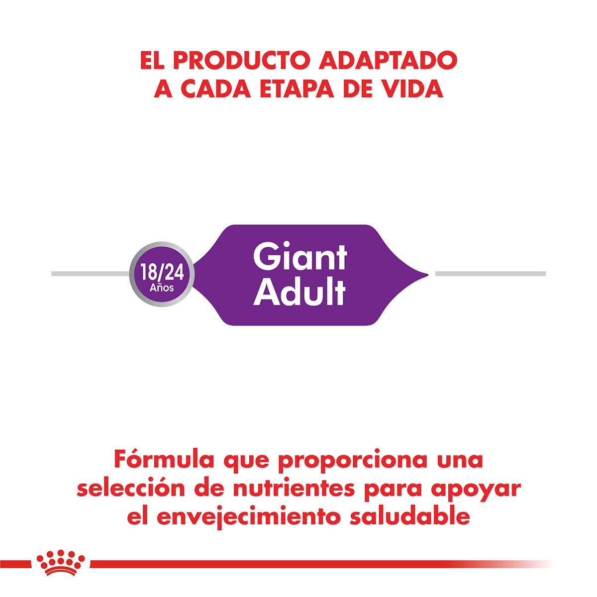 Royal Canin Giant Adult ayuda es un alimento para perros adultos de talla gigante (a partir de 45 kg). A partir de los 18/24 meses de edad. Ayuda a mantener huesos y articulaciones saludables en perros de talla gigante, las cuales pueden estar sometidas a estrés debido a su peso corporal. Esta fórmula contiene un complejo exclusivo de antioxidantes para ayudar a neutralizar los radicales libres. Esta fórmula contiene un complejo exclusivo de antioxidantes para ayudar a neutralizar los radicales libres.