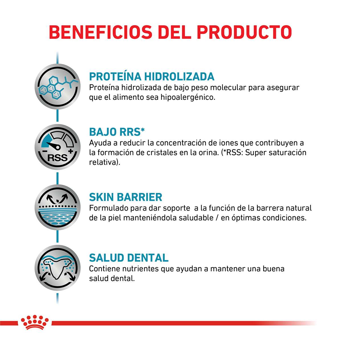 Alimento para perros adultos de menos de 10 kg de peso formulado con fuentes seleccionadas de proteína y carbohidratos adecuadas para el manejo de reacciones adversas a ingrediente. Royal Canin Hypoallergenic Small Dog contiene proteína hidrolizada de bajo peso molecular, alta digestibilidad y muy baja alergenicidad. Además, la formación de orina subsaturada (bajo RSS) contribuye a disminuir la disponibilidad de los iones necesarios para la formación de cálculos urinarios. Este alimento promueve un ambiente urinario desfavorable para la formación de cálculos de estruvita y oxalato de calcio.