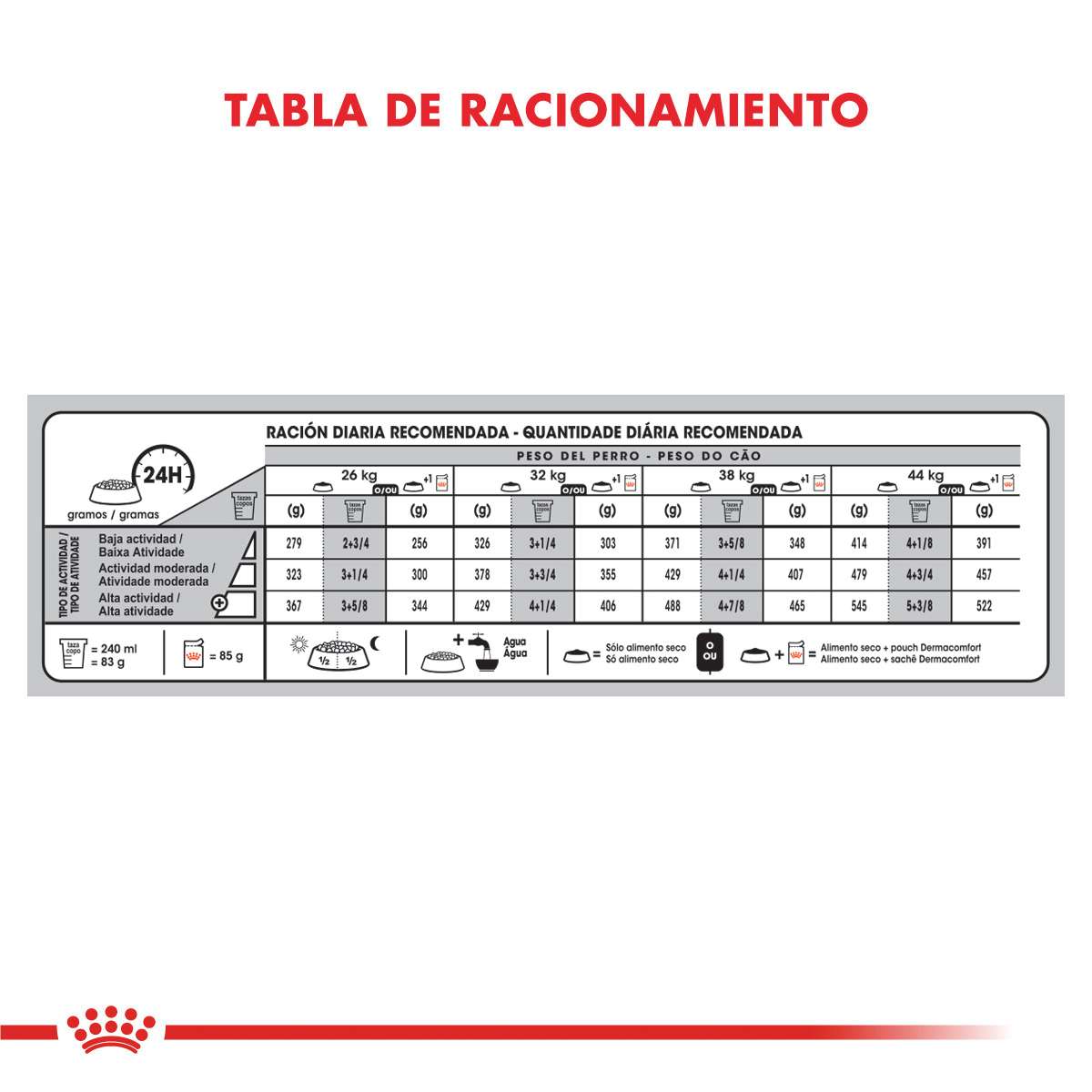 Alimento para perros adultos y maduros de talla grande (de 26 a 44 kg) propensos a la irritación cutánea y al prurito, a partir de los 15 meses de edad. Royal Canin Maxi Dermacomfort posee una fórmula específica con una selección de fuentes de proteínas de muy alta calidad y está especialmente indicado para perros de tamaño grande propensos a la irritación de la piel y el prurito. Su combinación única de nutrientes ayuda a reforzar la barrera cutánea, ya que combina ácidos grasos Omega 6 (incluyendo al ácido gamma linolénico) y ácidos grasos Omega 3 (incluyendo EPA y DHA) conocidos por sus efectos beneficiosos para la piel. Además, satisface el apetito de los perros de talla grande gracias a los aromas rigurosamente seleccionados.