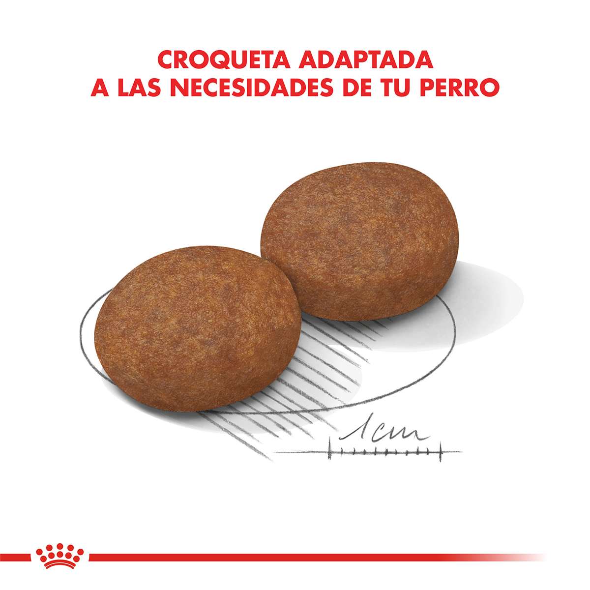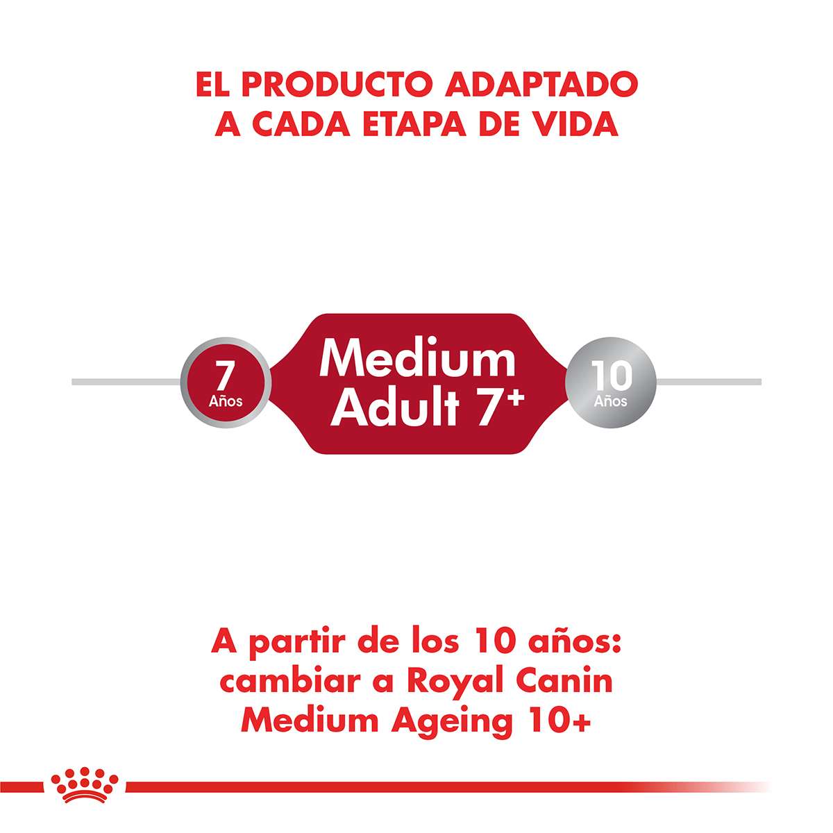 Alimento para perros maduros de talla mediana (de 11 a 25 kg), desde los 7 a los 10 años de edad. Royal Canin Medium Adulto 7+ aporta un contenido adaptado de nutrientes para ayudar a mantener la vitalidad en perros de talla mediana frente a los primeros signos del envejecimiento, y contiene un exclusivo complejo de antioxidantes que ayuda a neutralizar a los radicales libres. Ayuda a mantener una digestibilidad óptima gracias a una fórmula exclusiva que incluye proteínas de alta calidad y un aporte balanceado de fibras dietarias. Además, su fórmula contiene nutrientes que ayudan a mantener una piel y un pelaje saludable y se encuentra enriquecida con EPA-DHA.