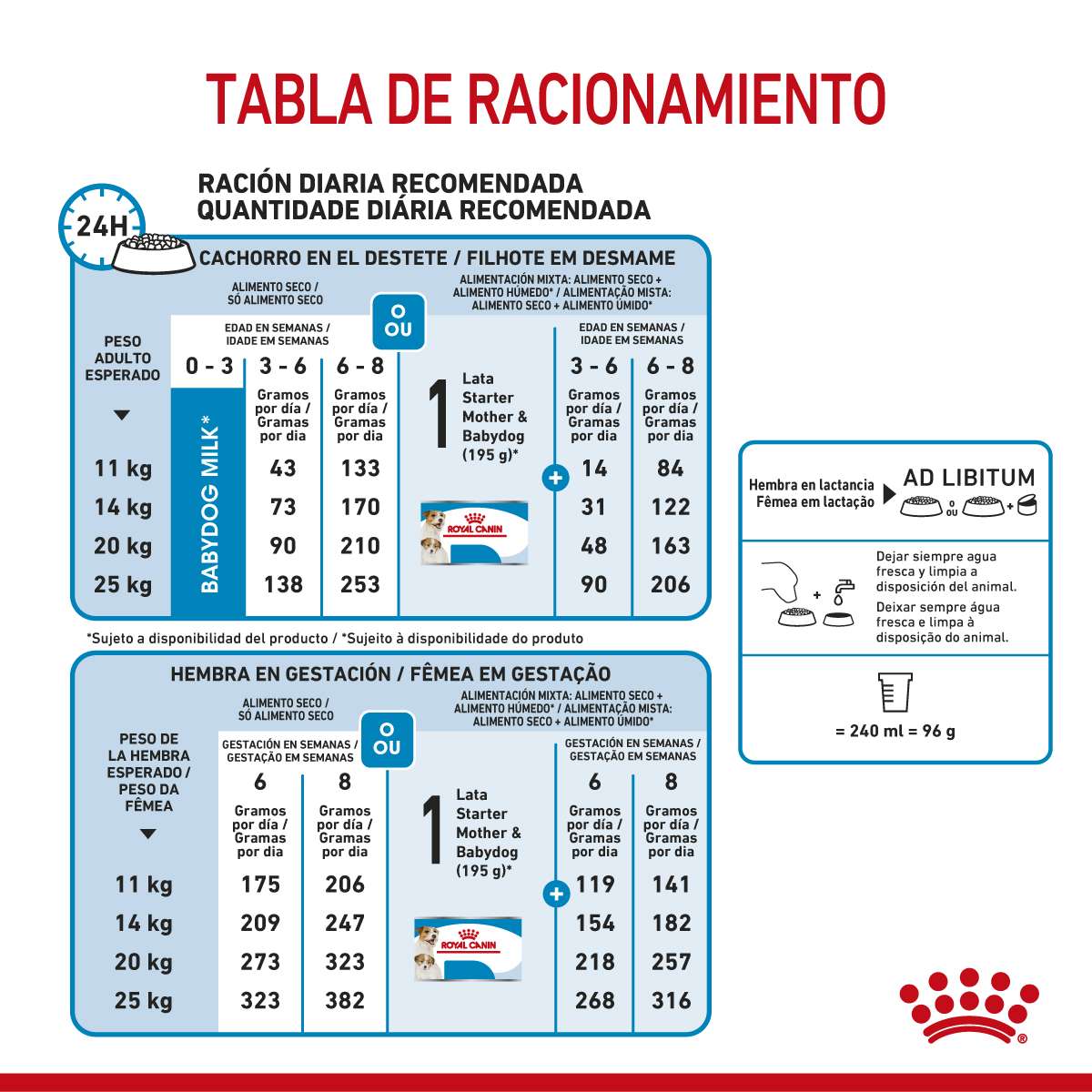 Este alimento brinda una respuesta nutricional adaptada a los elevados requerimientos energéticos del cachorro en etapa de destete, facilitando a la vez, la transición de la leche materna al alimento seco. Esto es debido a que durante esta etapa, los cachorros aumentan sus requerimientos y la leche materna ya no es suficiente para cubrirlos. En este momento deben atravesar un cambio progresivo en su alimentación, que es acompañado por la erupción de los dientes de leche que facilitarán la ingesta de alimentos sólidos. Royal Canin Medium Starter Mother & Babydog presenta una croqueta de tamaño, forma y dureza especialmente diseñados para facilitar la transición de una dieta líquida a una dieta sólida, ya que las croquetas se rehidratan fácilmente, logrando una consistencia de papilla muy palatable para el cachorro y su madre.