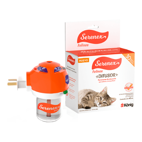 Serenex Difusor para Felinos | Feromonas tranquilizantes es un producto a base de feromonas sintéticas M2B, liberadas a través de un vapor constante. Estas feromonas, con acción análoga a las secretadas naturalmente durante la maternidad y a las feromonas faciales felinas, ayuda a controlar conductas inadecuadas en los felinos. Estos comportamientos generalmente son consecuencia del estrés y la ansiedad ante situaciones desafiantes y se manifiestan por ejemplo con aullidos, destrucción de muebles y objetos, eliminación de orina y heces en lugares inapropiados, etc.