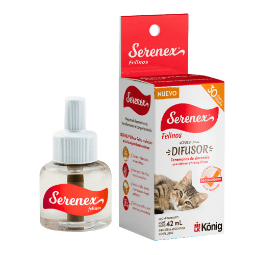 Serenex Repuesto de Difusor para Felinos | Feromonas tranquilizantes es un producto a base de feromonas sintéticas M2B, liberadas a través de un vapor constante. Estas feromonas, con acción análoga a las secretadas naturalmente durante la maternidad y a las feromonas faciales felinas, ayuda a controlar conductas inadecuadas en los felinos. Estos comportamientos generalmente son consecuencia del estrés y la ansiedad ante situaciones desafiantes y se manifiestan por ejemplo con aullidos, destrucción de muebles y objetos, eliminación de orina y heces en lugares inapropiados, etc.